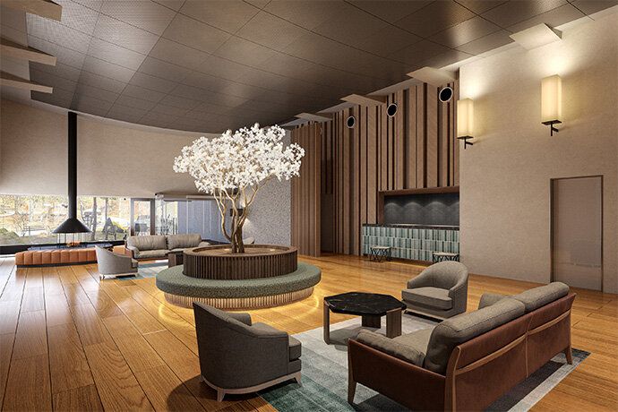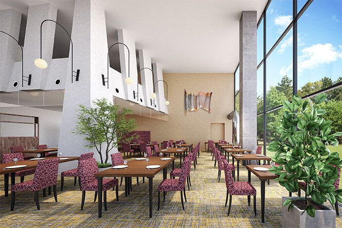 「フレンチレストラン~Le Plateau~」と「日本料理レストラン~宝寿~」は、森の湖畔で過ごすような遊び心を感じさせる、中庭と調和した空間へとリニューアルいたします。